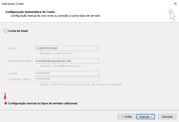 2. Na tela seguinte, insira os dados do e-mail, marque a caixa "Configuração manual ou tipos de servidor adicionais" e clique em "Avançar".