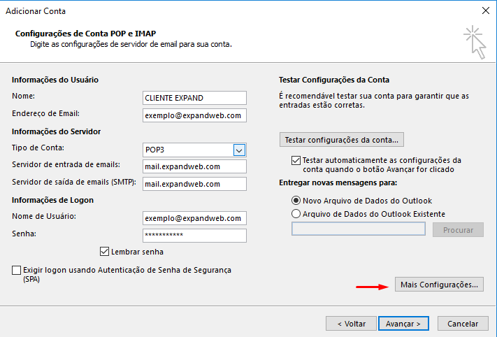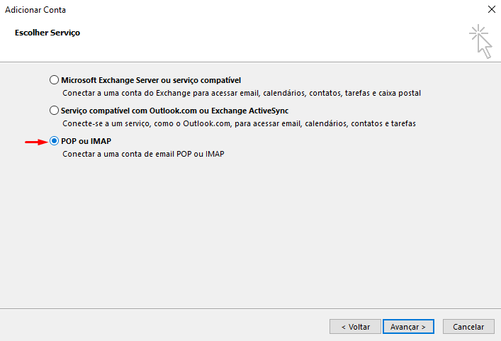 Utilize a configuração avançada para adicionar uma conta de e-mail POP no Outlook para Windows.