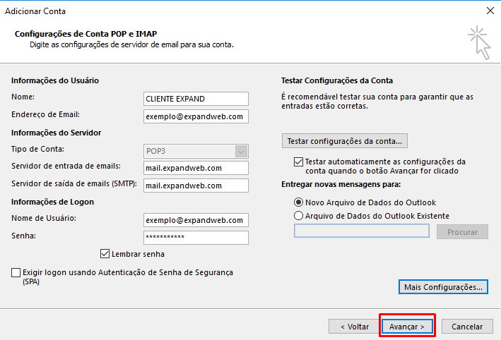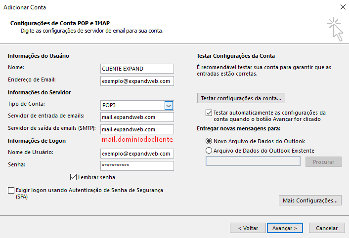 Servidor de saída de e-mails (SMTP): digite mail.seudomínio.com.br