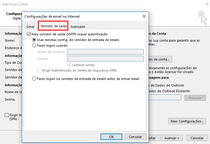 6. Clique na guia "Avançado" e habilite a opção "Meu servidor de saída (SMTP) requer autenticação" e "Usar mesmas config. do servidor de email de entrada".