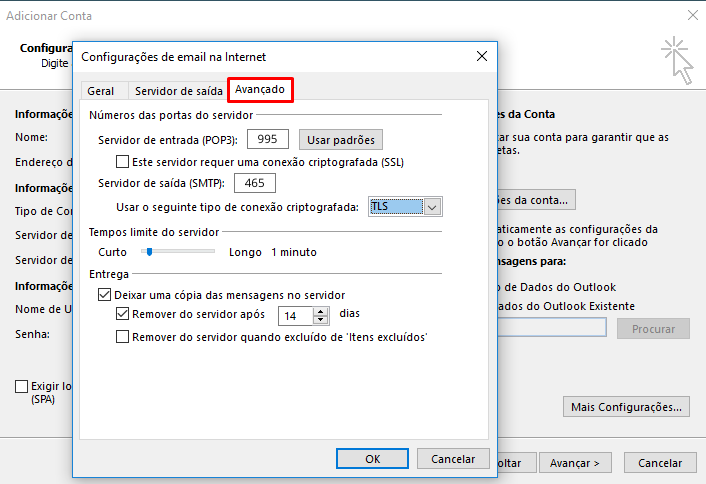 Marque as opções: "Deixar uma cópia das mensagens no servidor" e "Remover do servidor após": 14 dias.